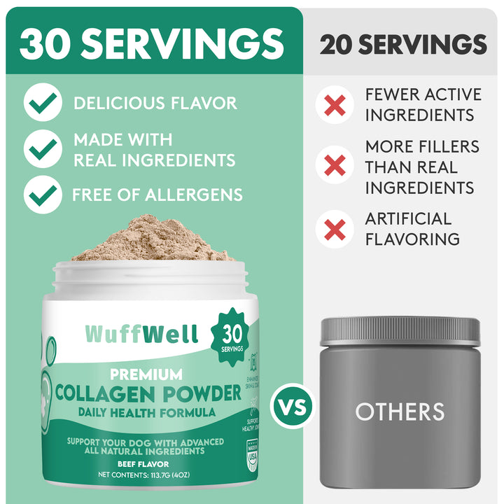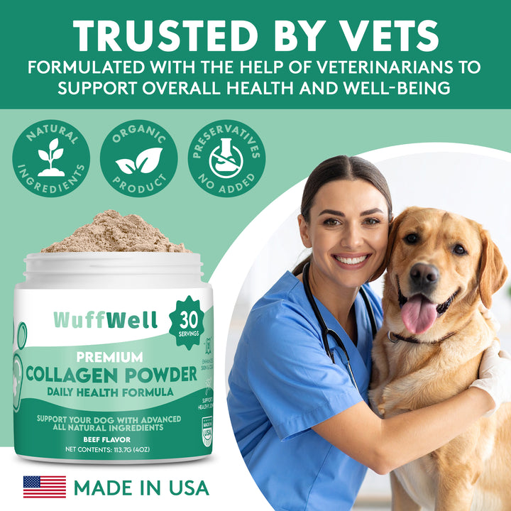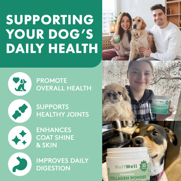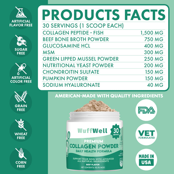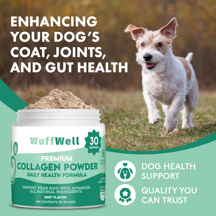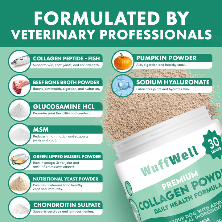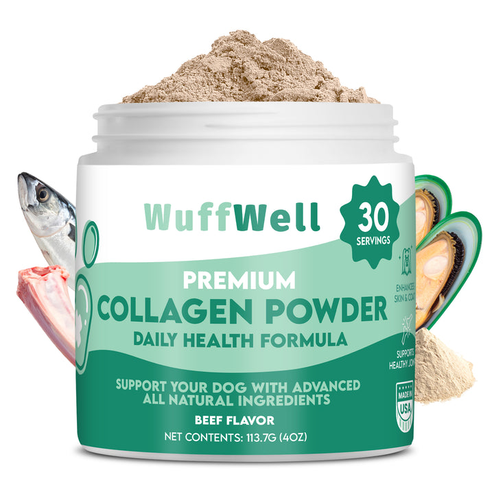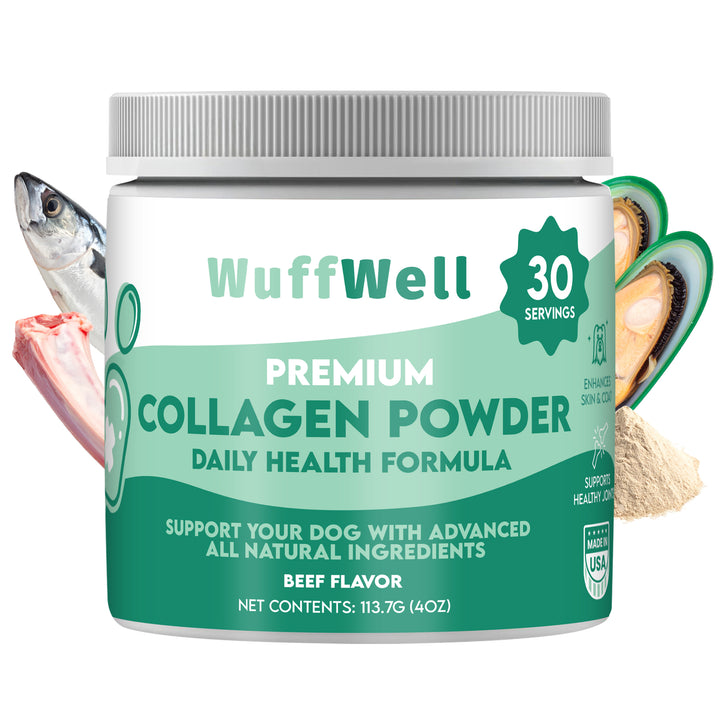 Vets recommend collagen supplements for dogs with joint stiffness, arthritis, or mobility issues. WuffWell Collagen combines hydrolyzed collagen peptides, glucosamine, chondroitin, and hyaluronic acid to support cartilage repair, joint lubrication, and bone strength. It also improves skin hydration and coat quality. Safe for daily use and easy to mix with food—consult your vet before use if your dog has health conditions or takes medication.